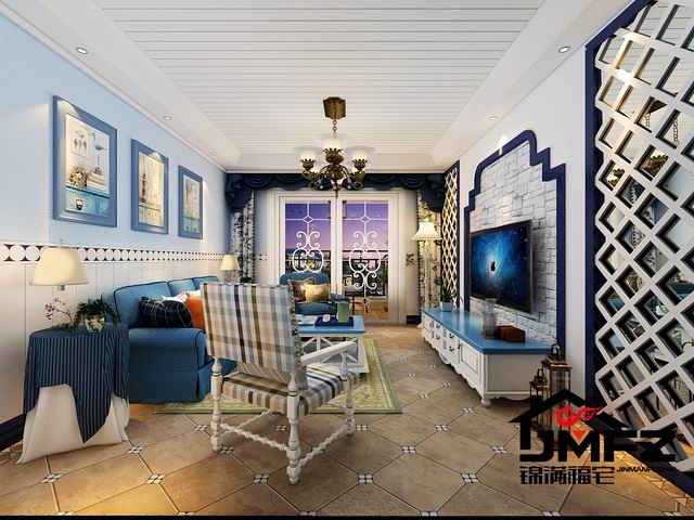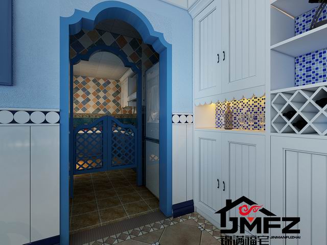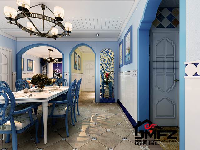 設(shè)計說明:這是一套三室兩廳一廚兩衛(wèi)的戶型,整體裝修風(fēng)格為地中海風(fēng)格。整體色調(diào)以藍色與白色為主,這種色調(diào)搭配也是比較典型的地中海顏色搭配。電視墻做了一個對稱的造型,兩邊鏤空花格加銀鏡也顯得比較大氣。門洞多采用拱形門洞,更加體現(xiàn)了地中海風(fēng)格。根據(jù)客戶的生活需求以及對客戶的了解,本設(shè)計對墻體進行了一個小小的改造,將客臥室門口那面墻直接打掉改成了一間開放式書房,門口旁邊很貼心的做了一個小吧臺,同時也滿足了一個休閑的區(qū)域。整體色調(diào)造型上看著比較干凈舒服。