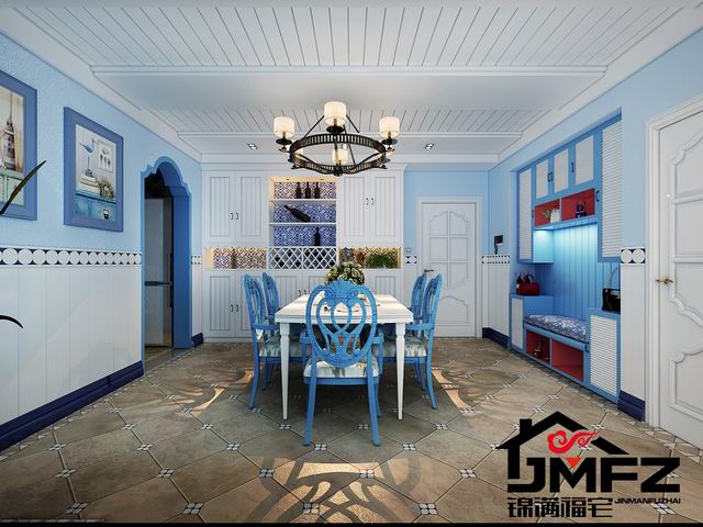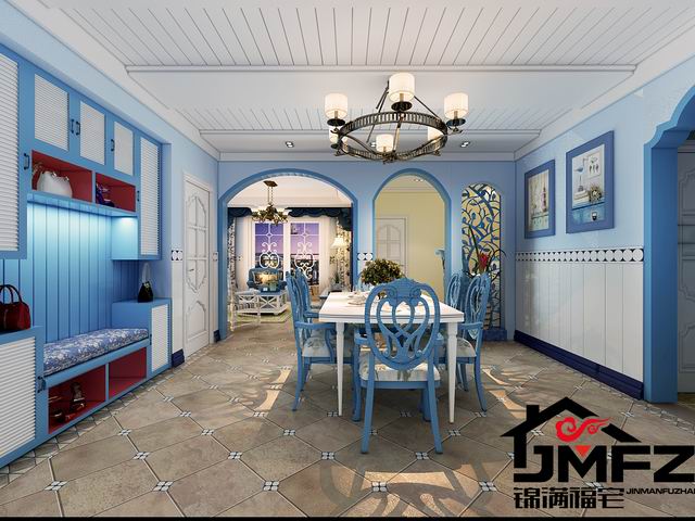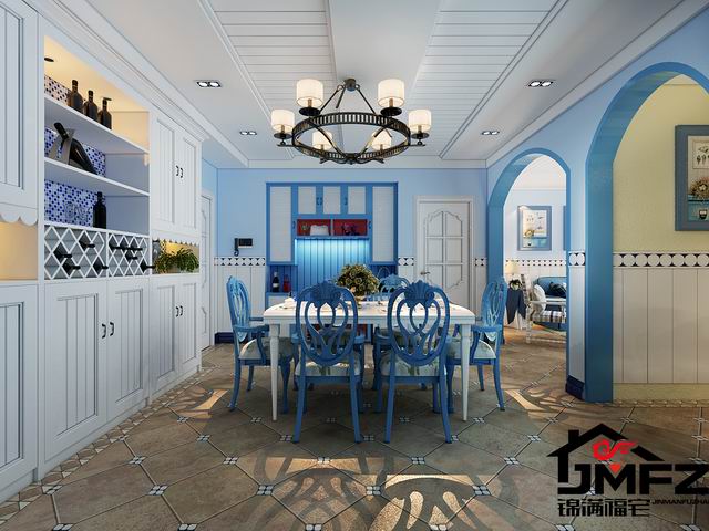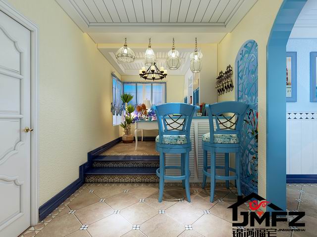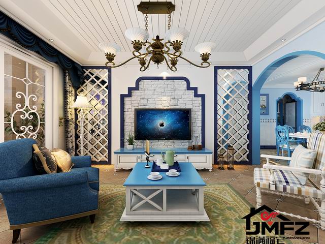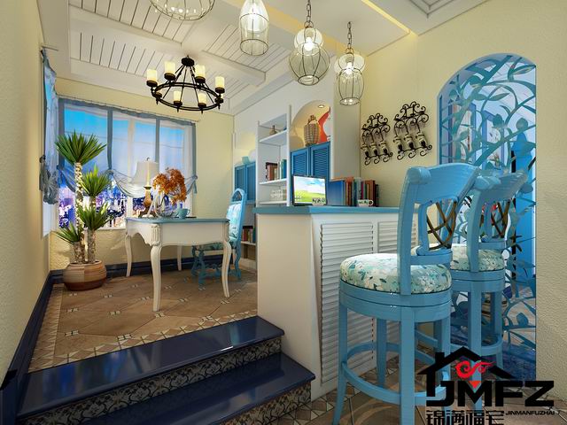 設(shè)計說明:這是一套三室兩廳一廚兩衛(wèi)的戶型,整體裝修風(fēng)格為地中海風(fēng)格。整體色調(diào)以藍色與白色為主,這種色調(diào)搭配也是比較典型的地中海顏色搭配。電視墻做了一個對稱的造型,兩邊鏤空花格加銀鏡也顯得比較大氣。門洞多采用拱形門洞,更加體現(xiàn)了地中海風(fēng)格。根據(jù)客戶的生活需求以及對客戶的了解,本設(shè)計對墻體進行了一個小小的改造,將客臥室門口那面墻直接打掉改成了一間開放式書房,門口旁邊很貼心的做了一個小吧臺,同時也滿足了一個休閑的區(qū)域。整體色調(diào)造型上看著比較干凈舒服。